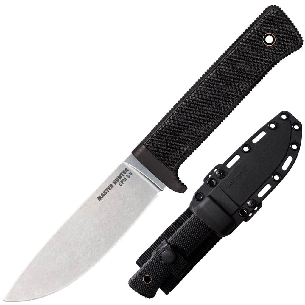 Featuring an extra broad American CPM3-V High Carbon Steel blade and honed by hand to a razor sharpness that has to be felt to be believed the Master Hunters curved cutting edge slices effortlessly through even the toughest hide while its stout but sharp drop point makes field dressing and skinning a breeze. The spine of the blade is a full 3/16″ thick to allow for the necessary strength and stiffness to field dress and skin even the biggest animals. The grip is specially designed to promote long use without fatigue. Made of the shock absorbent Kray-Ex and featuring our deeply checkered surface it won’t slip no matter how cold wet or bloody your hands get and it will give you a positive and secure purchase on your blade even when wearing thick gloves. Plus Kray-Ex? has specially enduring advantages for a hunter in that it will never rot shrink crack splinter or mildew and is completely impervious to even the harshest weather. For safety the Master Hunter comes in a adaptable and versatile Secure-Ex sheath that will accommodate just about any belt pack or rig.