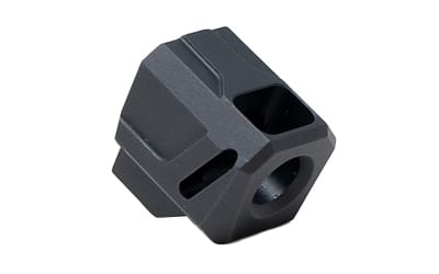 Constructed of 6061 aluminum with a black anodized finish, Faxon Pistol Compensators feature a uniquely angled front port single chamber design, enabling the compensator to improve consistency while reducing muzzle climb and recoil. The angled ports allow gas to deflect upwards as opposed to only deflecting sideways, reducing up and down muzzle movement and improving reliability. Barrel protrusion is designed to fit flush with the slide and has been optimized for Faxon branded barrels. For all other barrels, the barrel should protrude .600″ or less for a flush fit. Each compensator comes complete with thread locker, two 6-32 set screws, and a 1/16 Allen wrench.