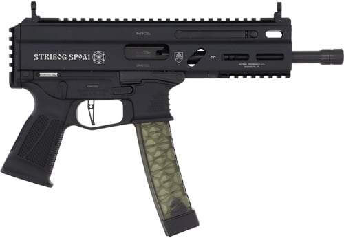Constructed with a polymer lower and aluminum upper, the Stribog SP9A1 combines a durable frame with a handguard featuring M-LOK slots and Picatinny rails for optics and accessory attachment. The model includes flip-up front and rear sights, an 8″ threaded barrel with thread protector, and ships with multiple 30-round magazines.