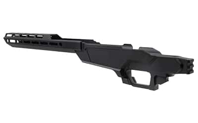 Heatseeker is an innovative, affordable chassis system for your bolt action rifle, allowing you to easily upgrade a traditional factory rifle stock for improved versatility and a sleek, modern appearance. This 1lb, 3 ounce chassis is machined from billet (solid block) high-strength 6061-T6 aluminum and includes a 10 ounce, 14″ handguard cut from a unique extrusion shape exclusive to Sharps Bros. Both the chassis body and the handguard are finished in a matte black Cerakote. The handguard features MLOK slots on 4 sides for various attachment options (light, bipod, night vision, ARCA rail…) and two quick disconnect fittings per side for sling attachment.